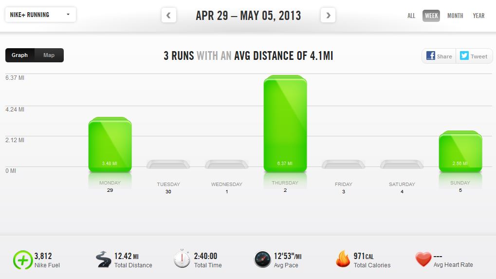 On Sunday, I did Couch to 10k week 5 day 3, which consisted of 2.5 miles and an average pace of 12:47. My best mile was my second at 12:19 min/mile.