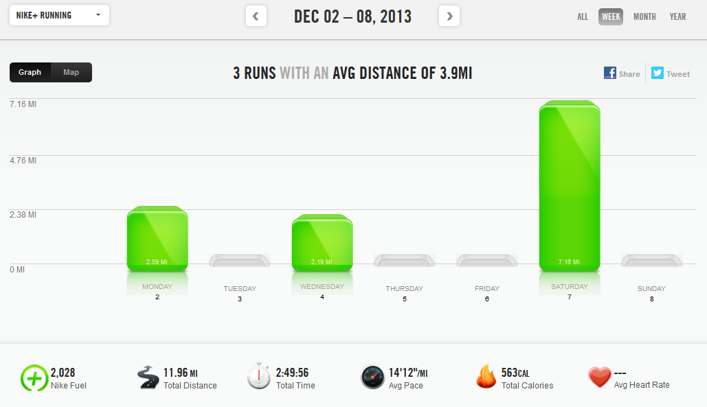 Tuesday was better, and I got off early due to it being Christmas Eve, so I went out for an afternoon run. I did intervals of 1:30 running, 1:30 walking, 3:00 running, 1:30 walking for three miles. It wasn’t too bad, once I remembered that I have to actually pace myself on the three minute runs. I think pacing is still a big part of my problem. I just want to run as fast as I could before I got injured, even though I can’t. It took me 42 minutes to get through three miles, which is the worst three mile run I’ve done since February. Ah, backtracking.