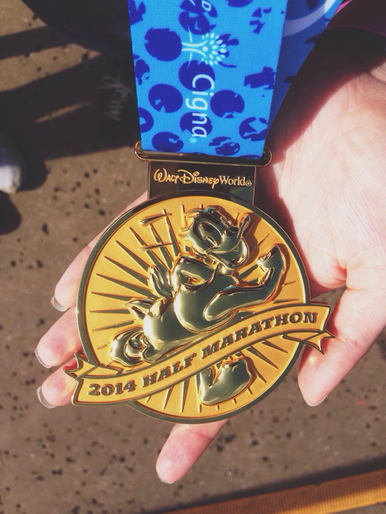 I kept pushing and ran through Epcot. The park had already opened by this time, so there were a ton of people around. Soon I could see the mile 13 marker! I was ready to sprint to the finish, but I had a long line of walkers in front of me in a narrow area, so I was forced to walk until I could get around them. Finally, I started my “sprint” (let’s face it; by this time in the race, a sprint to me was just under a 10 min/mi pace) and finished the 13.1 miles in 3:07:43!