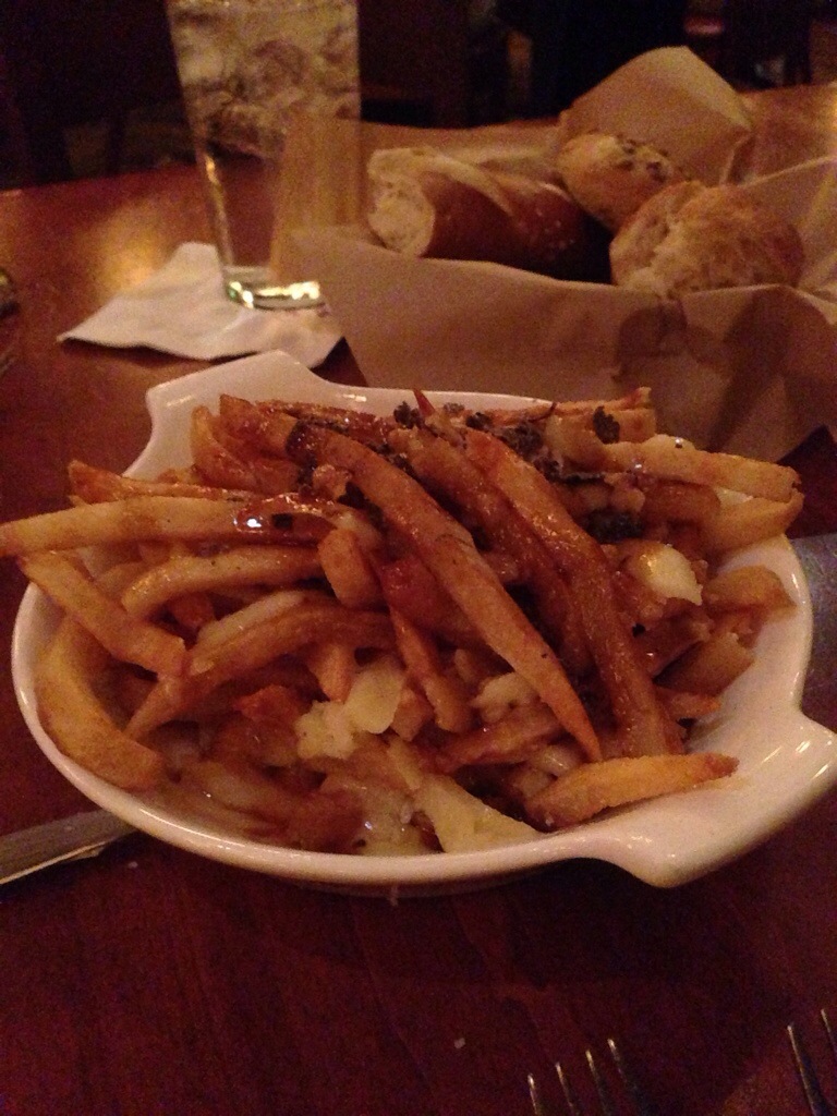 I was ready to be out of my soaking wet running clothes and especially out of my running shoes (I was ready to burn those things in a fire, but we made up later), so we headed back to the hotel, where I showered and changed before we headed back to Epcot to enjoy our day in the park. And, of course, I wore my race medal! We had a delicious lunch at Le Cellier in Canada, where I had filet mignon and tried poutine for the first time. It was sooo good.