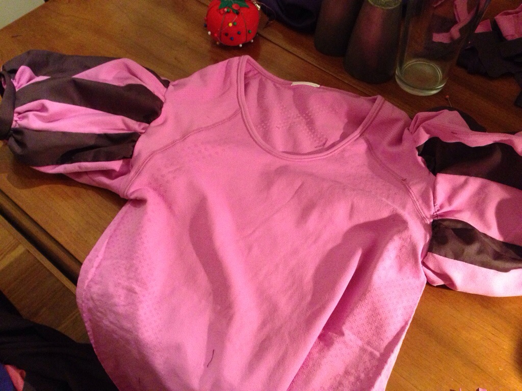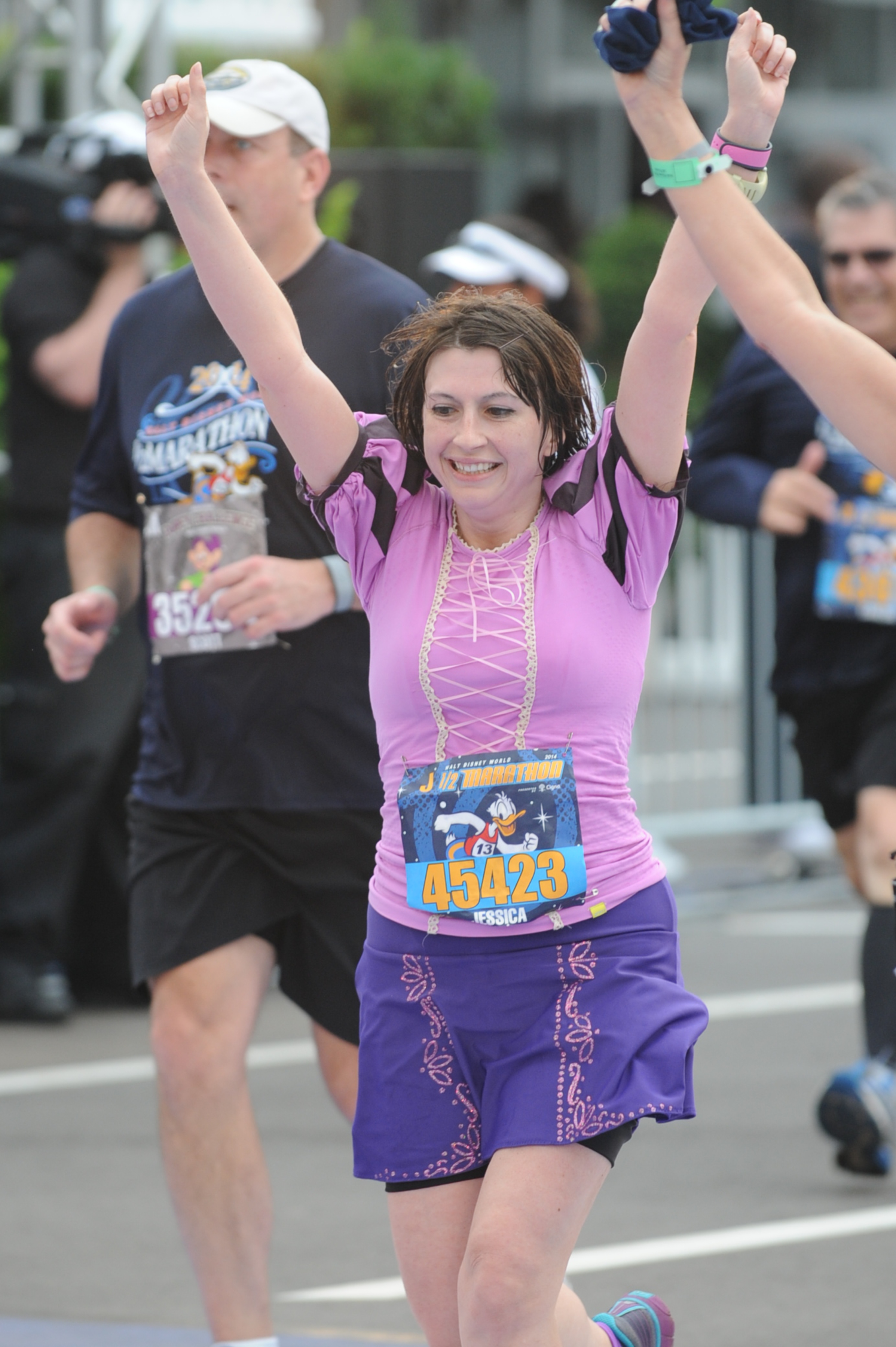 The phone rang at 3:15am with my wake-up call (from someone in “Frozen”, which I haven’t seen, so I don’t remember who it was). I got up and got dressed in my Rapunzel costume, quickly ate a bagel, popped a Pepto-Bismol, and hurried onto the bus that would take us to Epcot for the start of the race. I considered bothering Jonathan to get a photo before I headed out, but decided to let him sleep the extra hour before he had to get up and go to the spectator viewpoint in Magic Kingdom. So I have no “before” shots with my hair looking cute. All you get are sweaty photos. Sorry.