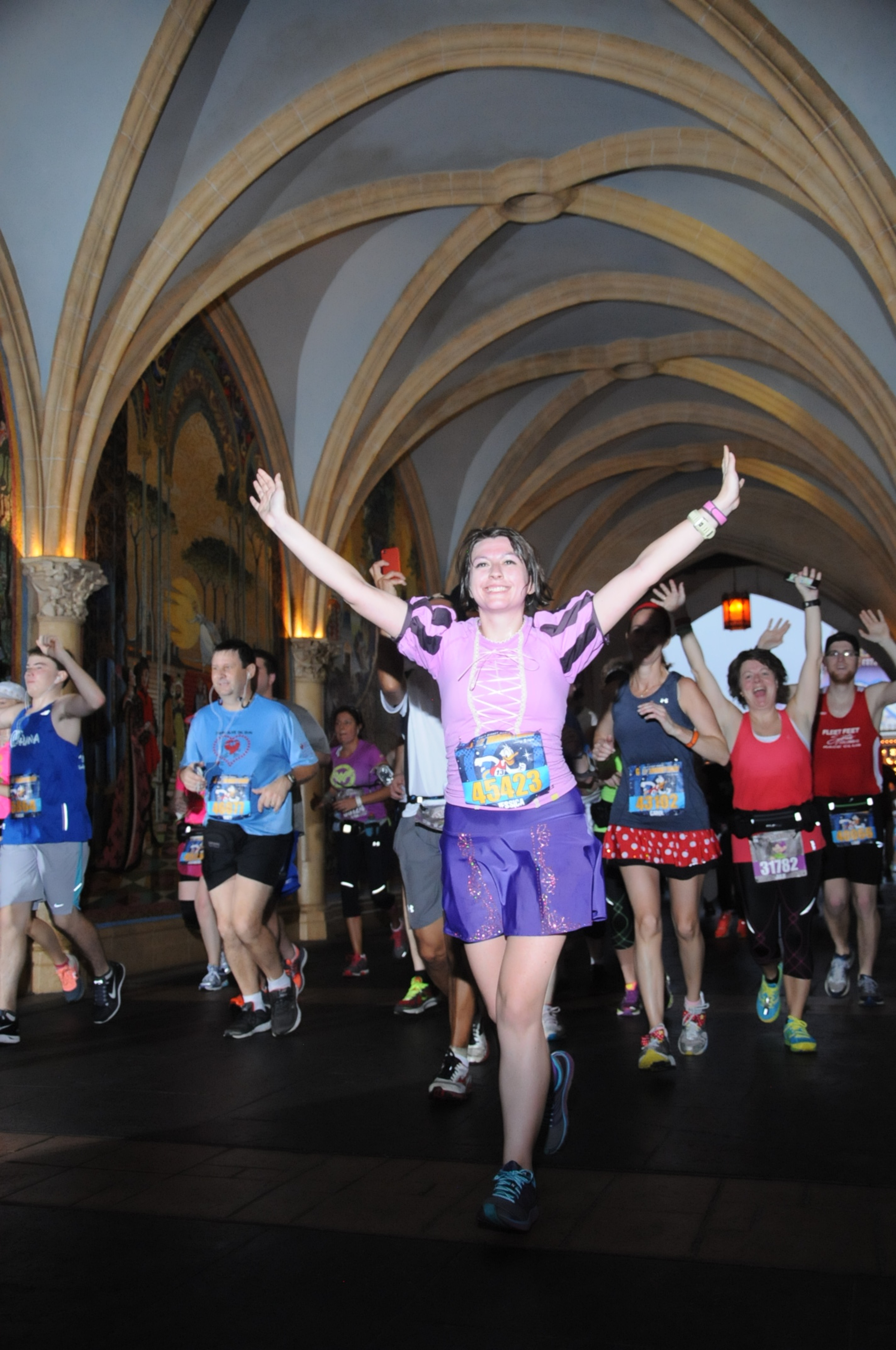We were coming up on Magic Kingdom. We entered from the side and then ran down Main Street, USA. Jonathan was there and snapped a couple shots of me. (Note how sweaty my hair is by this point. Gross.) Running down the crowd-lined street was awesome. We turned through Tomorrowland and then went into Fantasyland. Rapunzel’s music was playing! I look around, excited, hoping she was there to take pictures with. But no. All I saw were Winnie the Pooh characters and Donald and Daisy. But we were about to run through Cinderella’s castle!