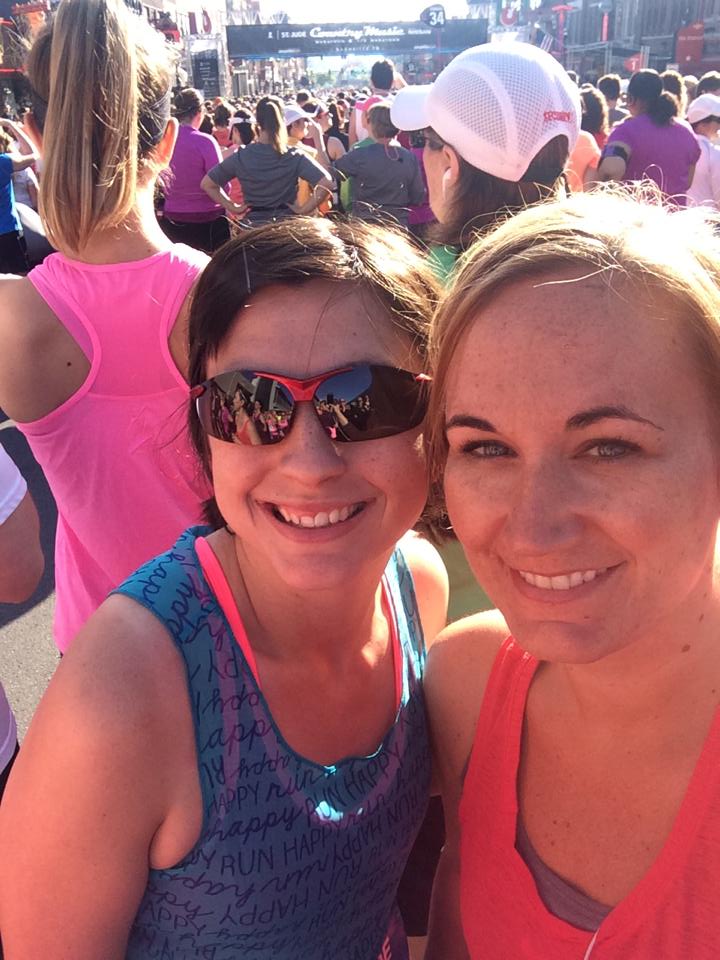 My alarm went off at 4:45 am. I got ready and was out the door by 5:30. Traffic was a little slow around downtown, but not too bad, and I managed to get in a good parking space at LP Field around 6am. From there, I met up with Amanda at her office to use the restroom (I try to avoid port-a-potties if at all possible) and apply sunscreen. Then we stopped by gear check and were in our corral at 7am. And then we waited…and waited…and took some selfies…