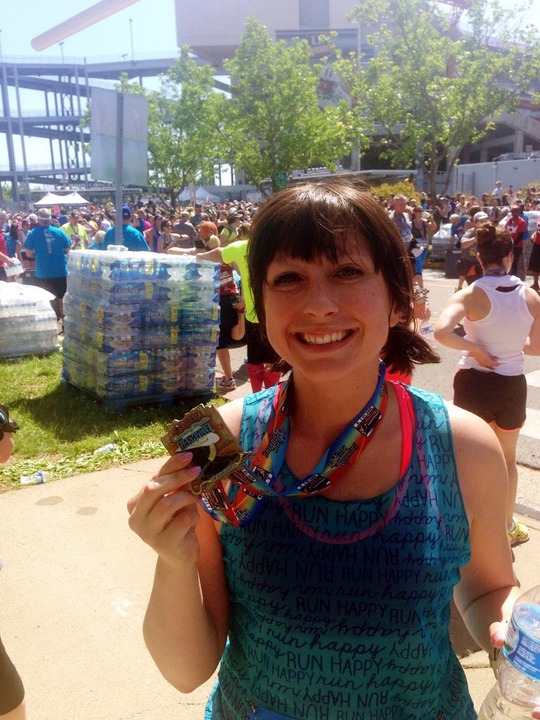 After I crossed the finish line, I got my medal, some water, and some chocolate milk. Jonathan and Andrew found me and we waited for Amanda to finish. She crossed the finish line in a little over three hours and officially became a half marathoner!