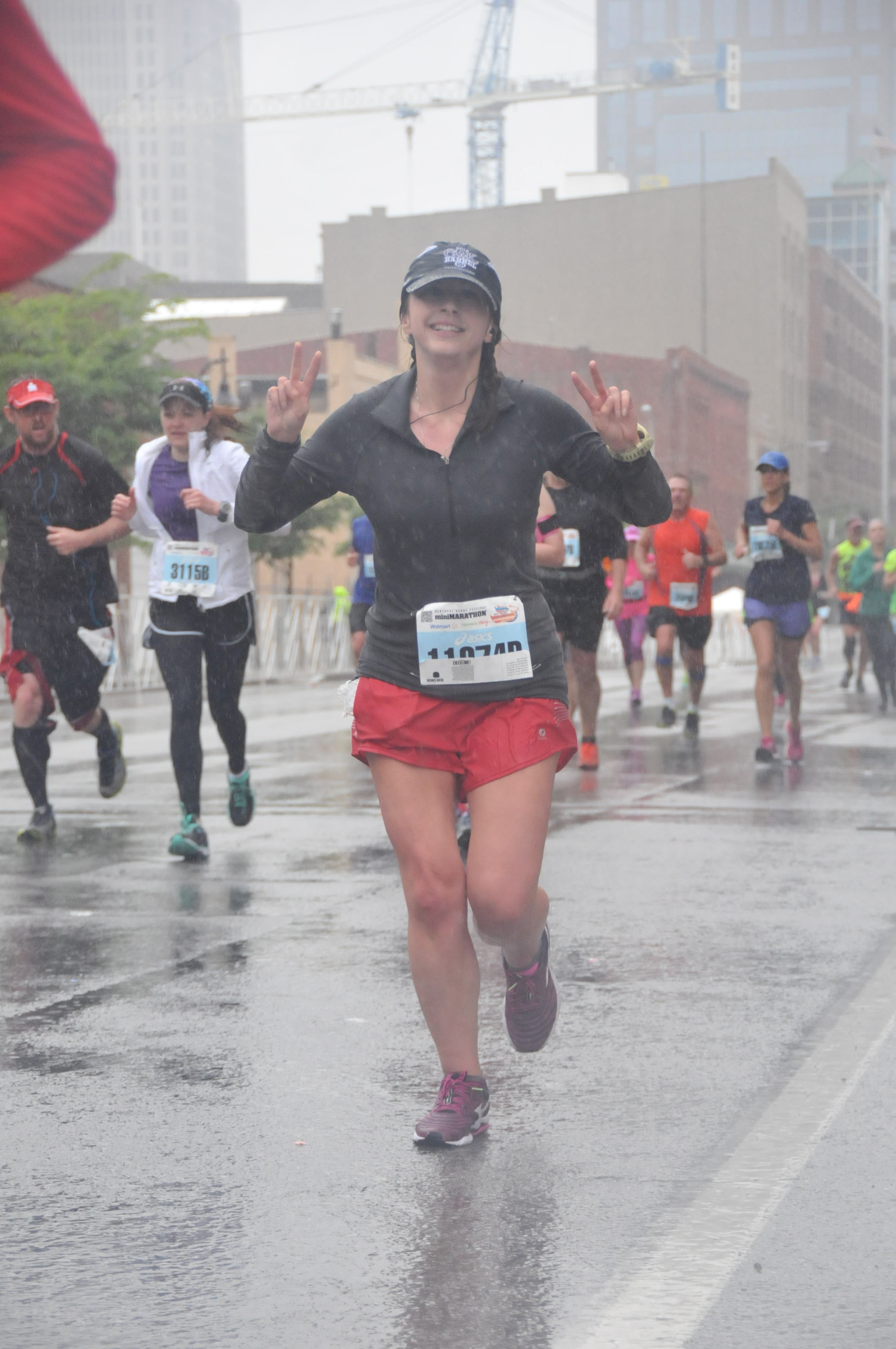Although the rain held off while we were in the corrals, it started to sprinkle right as I crossed the start line. The first mile actually went by super quick. Soon after I started, I saw Jonathan in front of the hotel cheering me on. I ran over and gave him a high five and he assured me I was almost done. Ha!