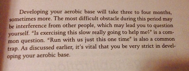 Every four weeks or so, I am to perform a MAF (Maximum Aerobic Fitness) test. You warm up for 15 minutes until the lower end of your zone. Then you run five miles maintaining staying in that zone. Because of cardiac drift (your heart rate will increase over time even when effort stays the same), the first mile should be the fastest and the last mile should be the slowest.